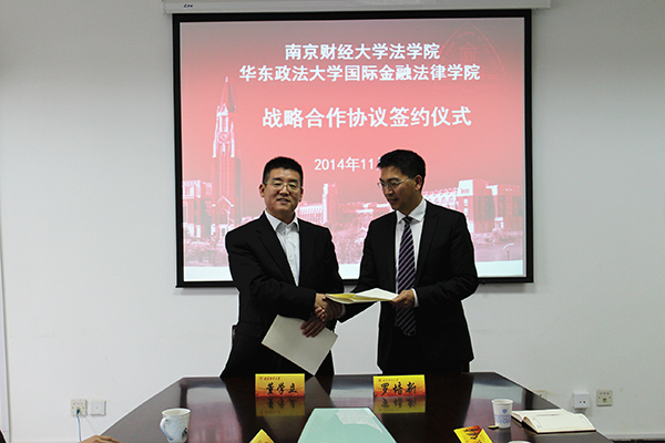 学术报告前,华东政法大学国际金融法律学院与我校法学院签署了战略合作协议。根据协议,双方将充分发挥教学与科研方面的优势,通过客座授课和讲座、学术交流、合作出版法律丛书、安排教师短期研修或调研、共同举办法律类论坛、共同创立并建设“中国金融法律产学研基地”等,为法学教育作出新的探索。