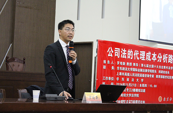 下午,华东政法大学科研处处长、国际金融法律学院院长、博士生导师罗培新教授应邀做客南财论坛,在仙林校区法政学科楼模拟法庭为我校法学院师生作了题为“公司法的代理成本分析路径”的学术报告。报告会由法学院副院长何旺翔主持。