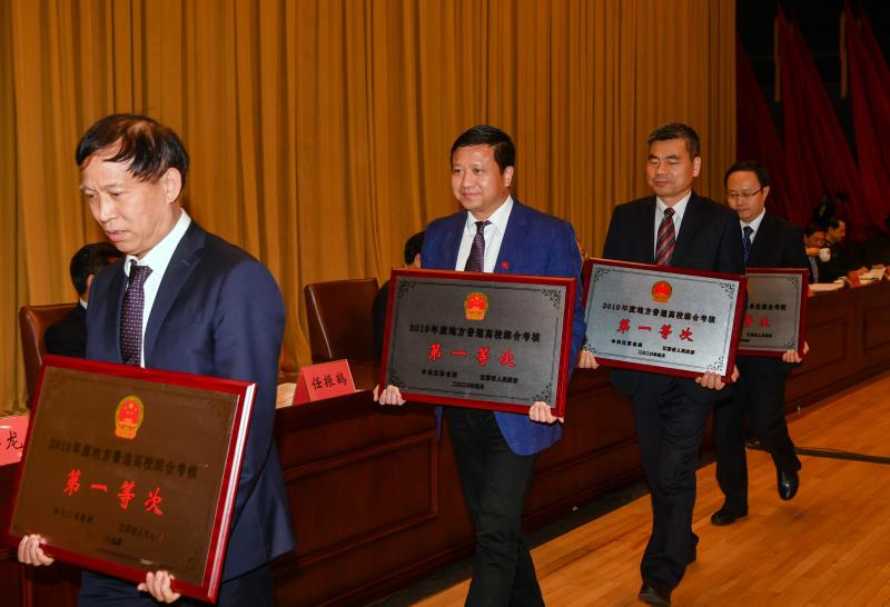 会议通报了我省2019年度综合考核结果,表彰了考核优秀的单位、地区和高校。我校荣获第一等次。校党委书记张利民代表学校上台领奖。