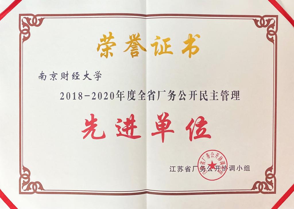近日,江苏省厂务公开协调小组下发了《关于表彰2018-2020年度全省厂务公开民主管理先进单位的决定》(苏厂开办[2020]1号),表彰了一批在厂务公开民主管理中发挥了积极作用的先进单位,我校被授予“2018-2020年度江苏省厂务公开民主管理先进单位”称号,这是对我校多年来校务公开、民主管理水平和成效的充分肯定和认可。