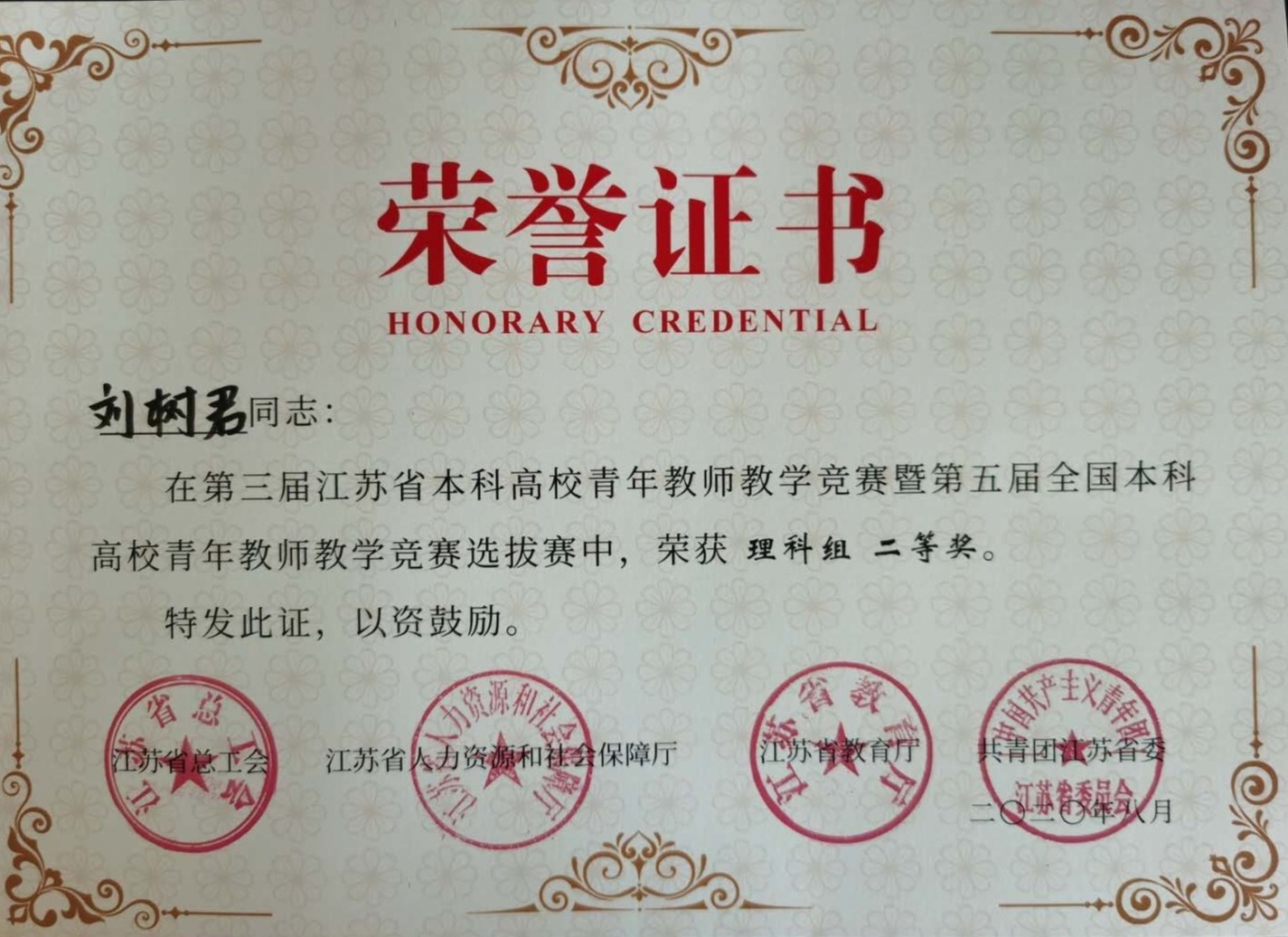 数学学院刘树君老师获理科组二等奖