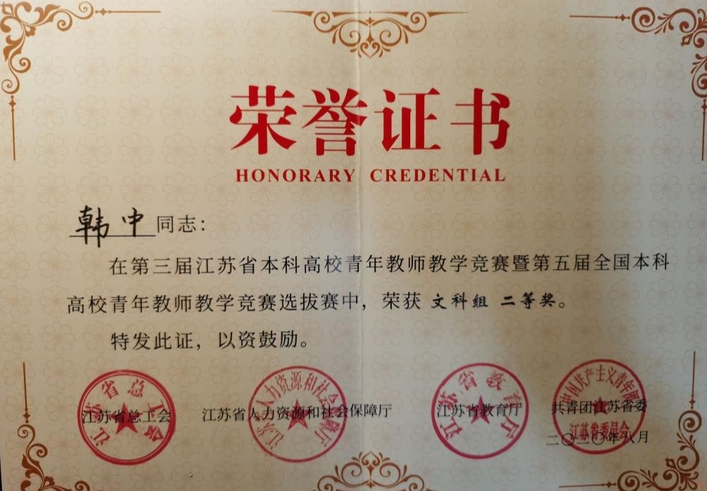 近日,第三届全省本科高校青年教师教学竞赛暨第五届全国本科高校青年教师教学竞赛选拔赛在南京举行。我校推荐参赛的教师在比赛中表现突出,展现了较高的专业素质、精湛的教学水平和良好的教学风貌,经济学院韩中老师获文科组二等奖,应用数学学院刘树君老师获理科组二等奖。