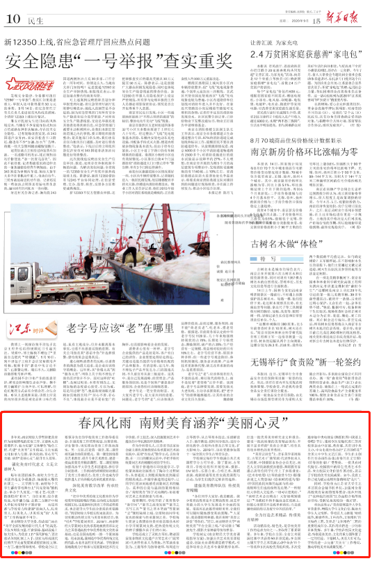 9月15日,《新华日报》以“春风化雨 南财美育涵养‘美丽心灵’”为题报道了我校美育工作成效。