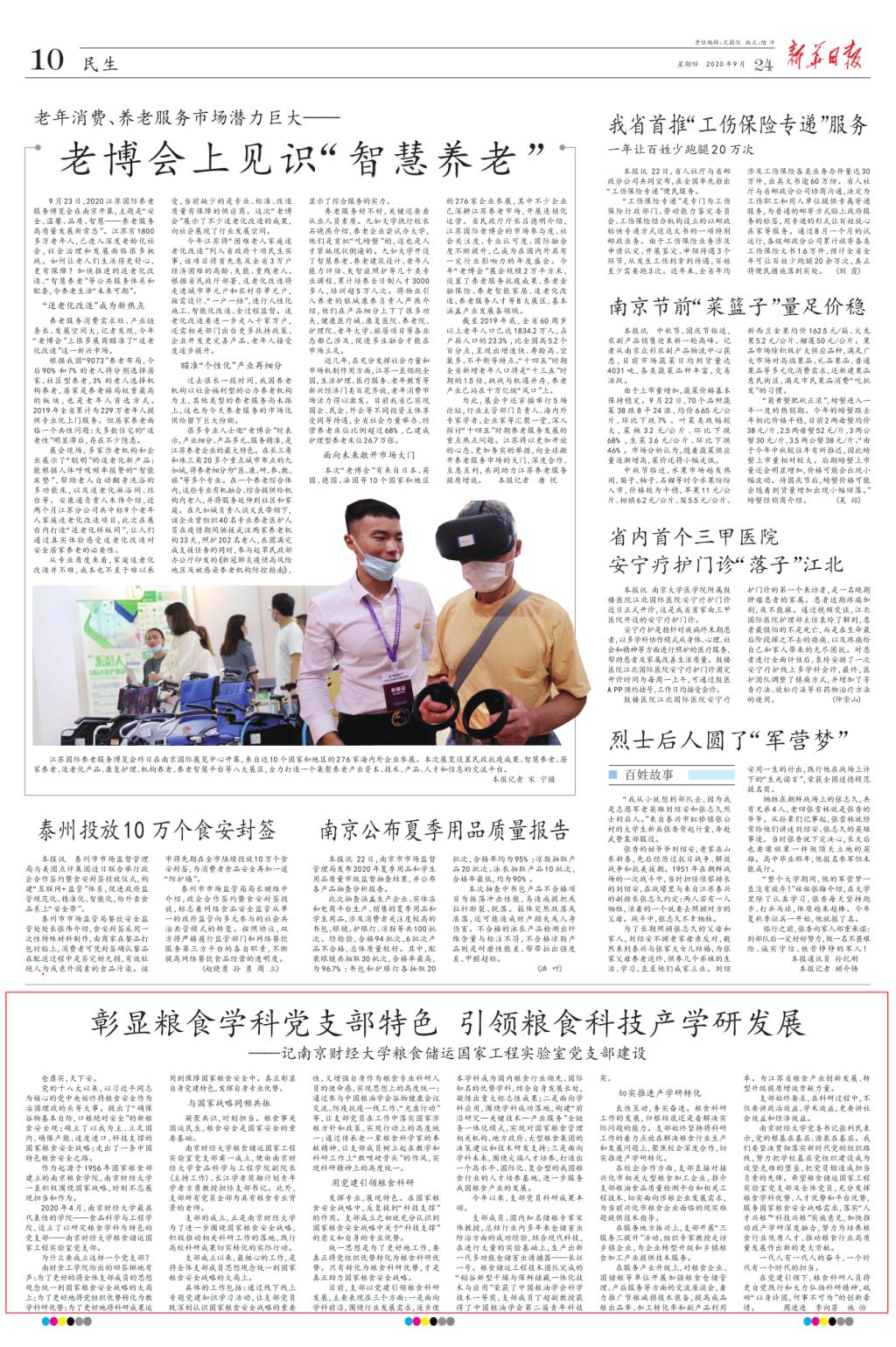 9月24日,《新华日报》以“彰显粮食学科党支部特色 引领粮食科技产学研发展——记南京财经大学粮食储运国家工程实验室党支部建设”为题报道了食品科学与工程学院粮食储运国家工程实验室党支部建设工作。文章从“与国家战略同频共振”“用党建引领粮食科研”“切实推进产学研转化”三个方面对食品科学与工程学院粮食储运国家工程实验室党支部设立的背景、科研成果和党建引领产学研转化效果进行了详细报道。