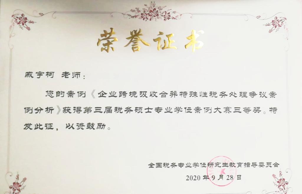 近日,我校2019级税务硕士研究生戚宇柯同学撰写的案例——《企业跨境吸收合并特殊性税务处理争议案例分析》,在第三届税务硕士专业学位案例大赛中获三等奖。该案例由我校财政与税务学院教授程瑶及行业导师——江苏国瑞兴光税务师事务所所长高允斌指导。