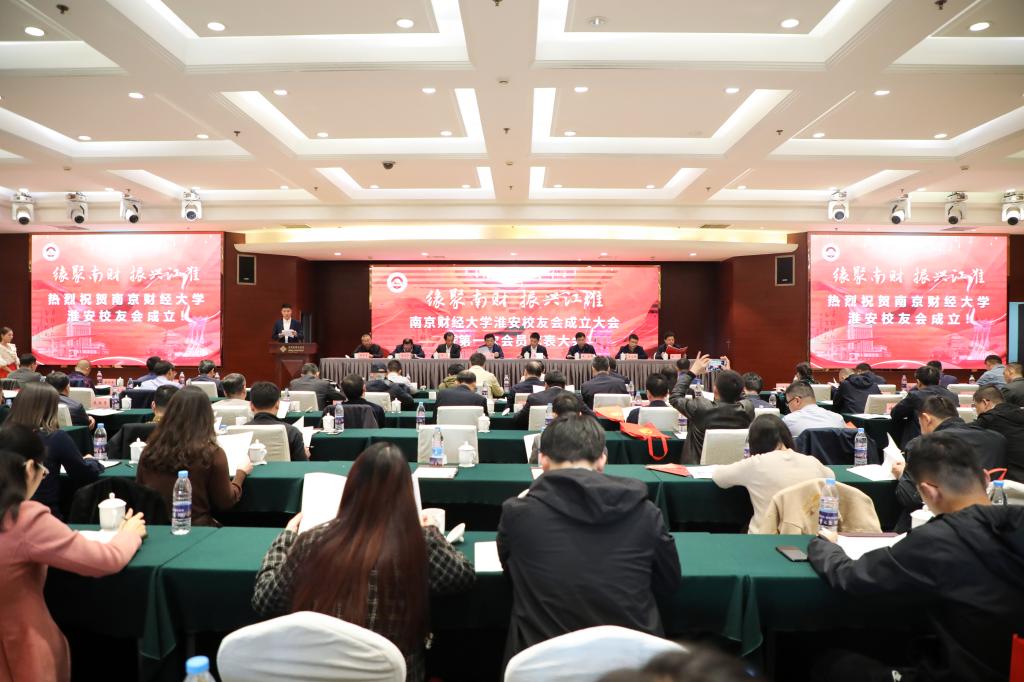 校对外联络处副处长(主持工作)王立峰宣读南京财经大学校友会贺信,物资学校校友会会长张先平代表地方校友会发言。福建、常州、扬州、宁波等省市的地方校友会纷纷发来贺信,对淮安校友会的成立表示衷心祝贺。