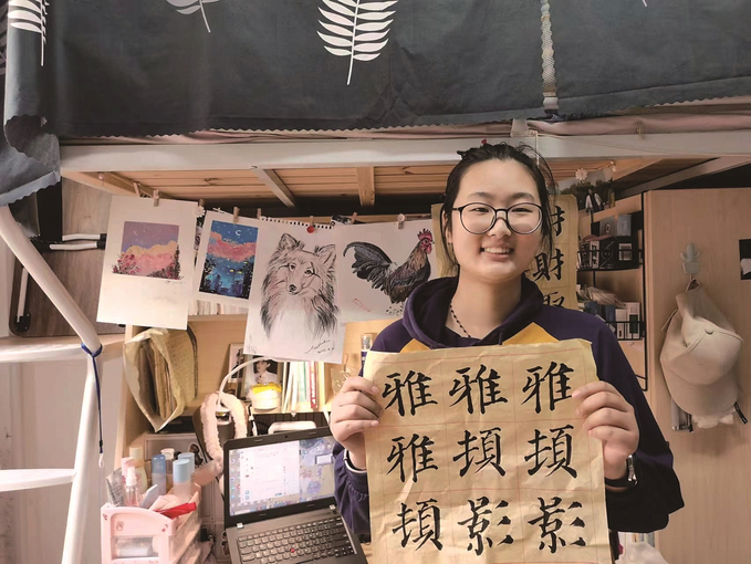 在宿舍的小天地里,南京财经大学外国语学院2020级本科生张耀月临摹中国画、练习书法,不仅释放了压力,也收获了精神的成长。(学生供图)
