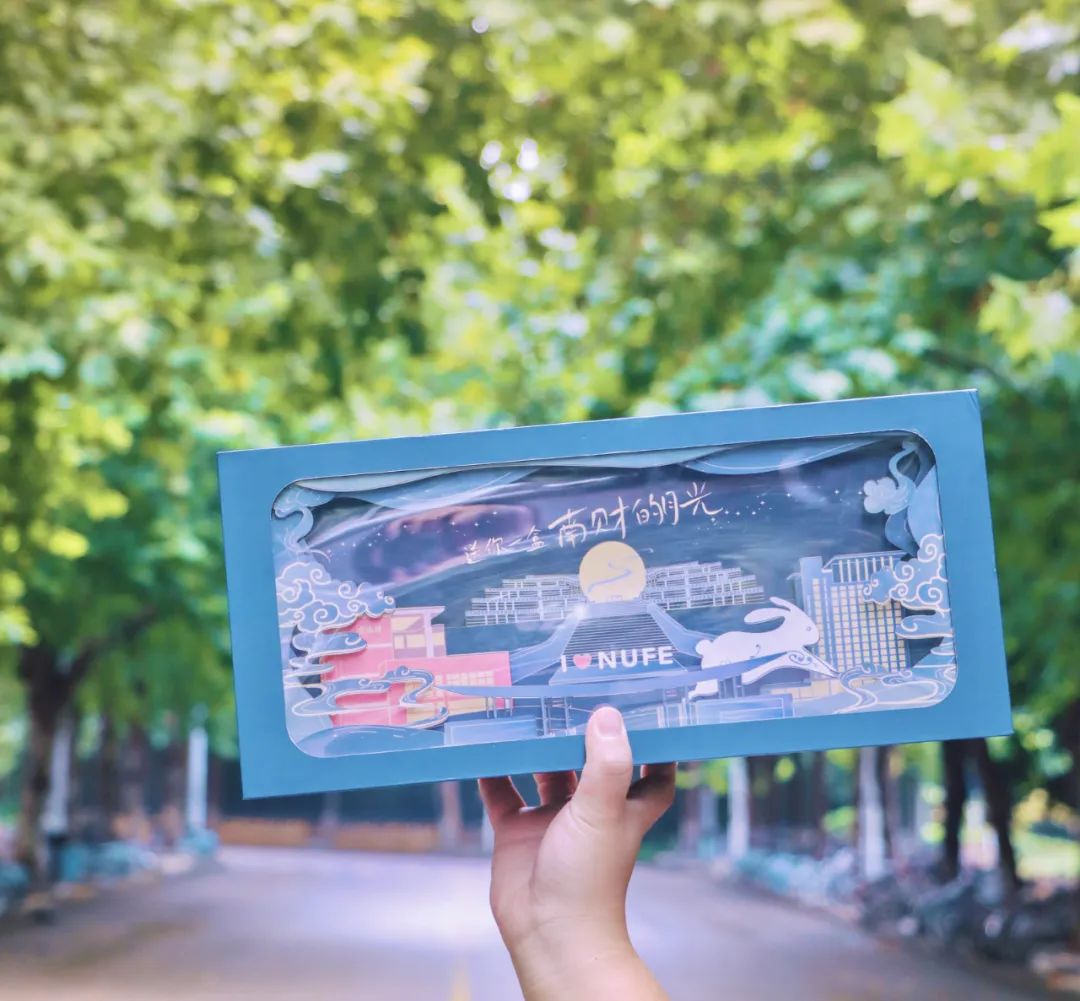 在中秋佳节将临之时,南财DIY文创月饼闪亮登场!由艺术设计学院的陈帅杰、谢远菁为主的月饼文创团队,将南财特色建筑与广式月饼相融合,设计了“送你一盒南财的月光”文创月饼等中秋文创。