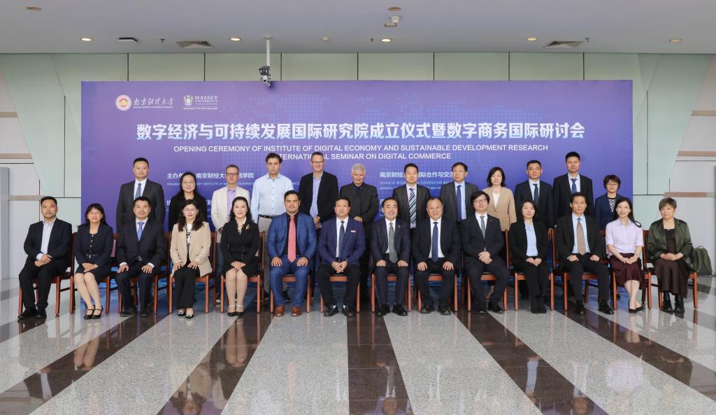 研究院揭牌后召开了数字商务国际研讨会,来自梅西大学、南京财经大学、德州大学达拉斯分校的专家学者围绕数字经济、跨境数字化贸易、数字商务、可持续发展等主题展开研讨。