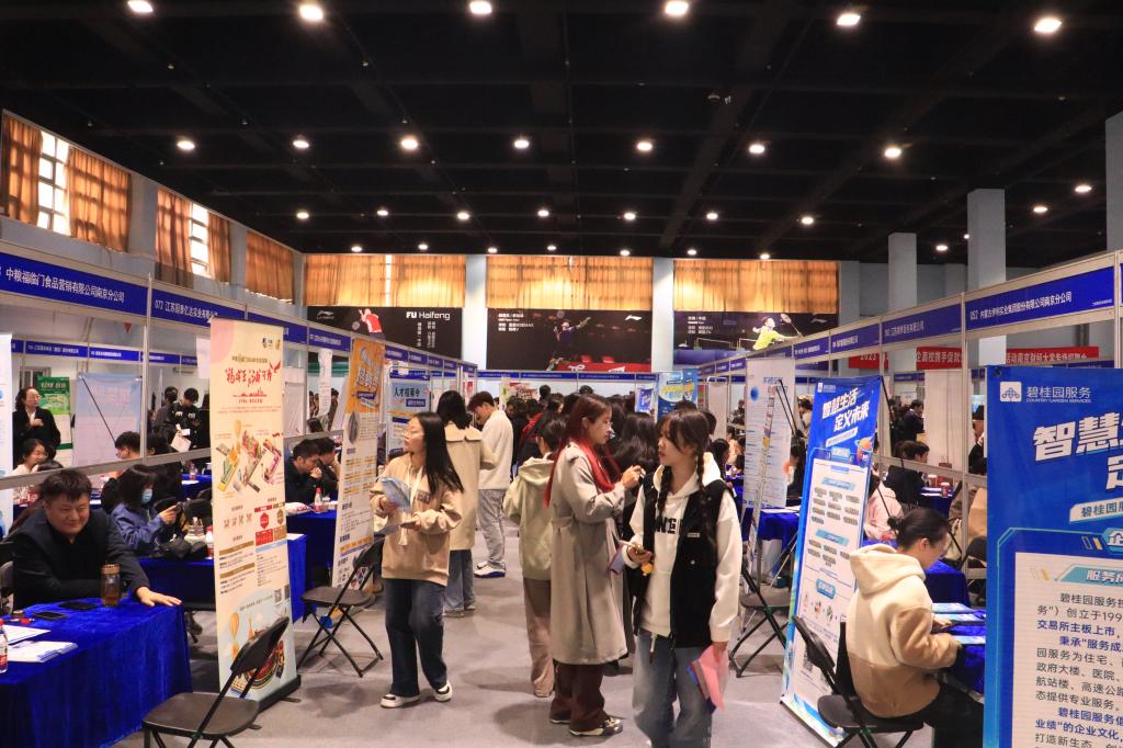11月10日,江苏省2024届高校毕业生秋季校园招聘月金融、商贸及现代服务业暨“百城万企”民企高校携手促就业行动(秋季)江苏系列活动专场招聘会在南京财经大学仙林校区体育馆举行。此次招聘会由江苏省教育厅、江苏省人力资源和社会保障厅、江苏省工商联主办,江苏省高校招生就业指导服务中心、江苏省劳动就业管理中心、江苏省职业介绍中心、南京市工商联、南京财经大学承办。