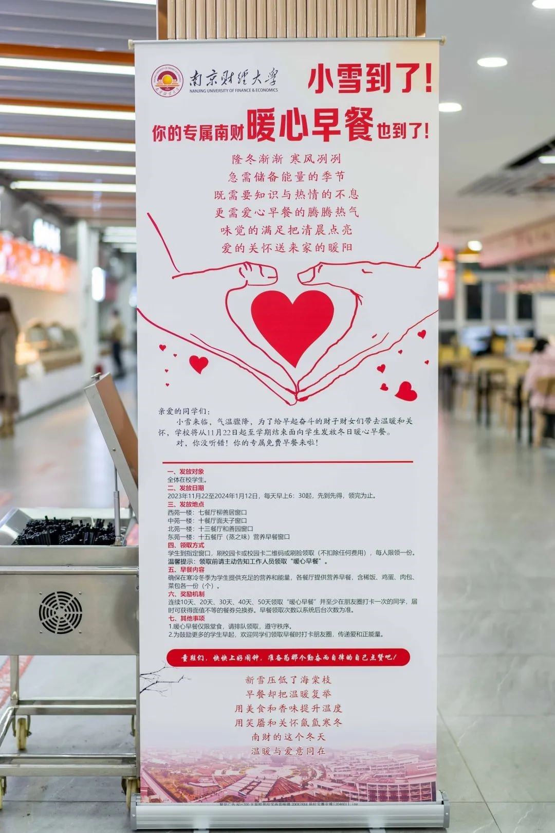 据了解,本次活动由学校党委学生工作部、学生处发起。南京财经大学党委学生工作部部长、学生处处长韩力争告诉记者,天气转冷,考研、考公、期末考试等各类考试临近,学校发起“暖心早餐”活动,不仅为了鼓励学生早睡早起,养成好的学习、生活习惯,也是对早起奋斗学子的暖心支持,同时还希望通过这种方式隐性帮扶家庭经济困难学生。“目前,我们暂定每天发放200份早餐,试行后会根据学生的响应度进行适当增加。”