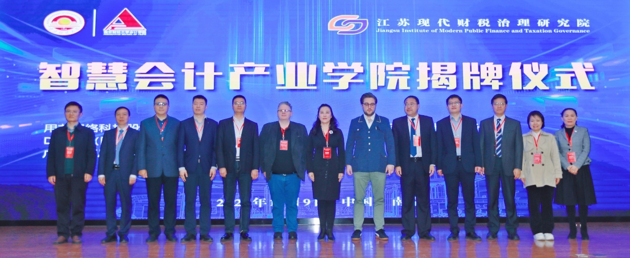 随后,来自用友网络科技公司、DAMA中国、天衡会计师事务所、福思特科技有限公司、爱尔兰都柏林圣三一大学、意大利路易斯商学院等单位的专家们跨界协同,为南京财经大学智慧会计产业学院举行了揭牌仪式。
