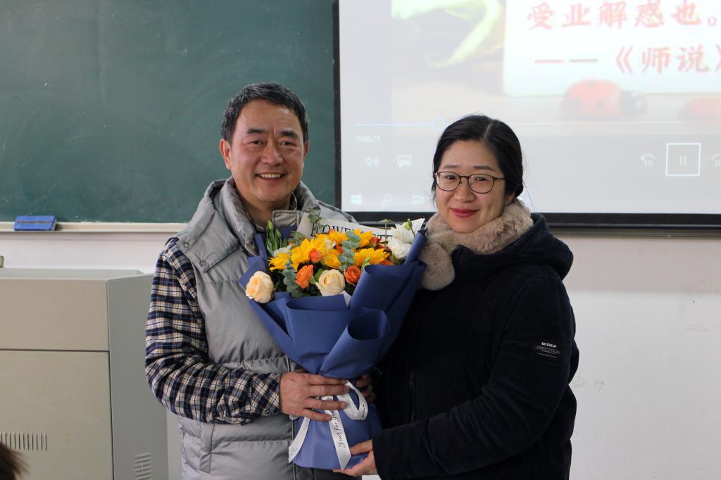 课堂上,校友、学院教师李丽丽老师为韩教授送上了鲜花。“我是信息工程学院2004届毕业生,毕业后就留在信息工程学院工作,韩教授是我的授业恩师、同事、领导,更是我职业生涯引路人。”李丽丽在谈到韩忠愿教授时表示,“我现在依稀记得当年那个在三尺讲台上侃侃而谈的韩老师,那个给我们传道、授业、解惑的韩老师,如今他即将离开热爱的‘三尺讲台’,而我也成长为‘他’,成为一名在教学岗位的一员,韩教授当年的谆谆教诲将一直激励着我不断前行。”