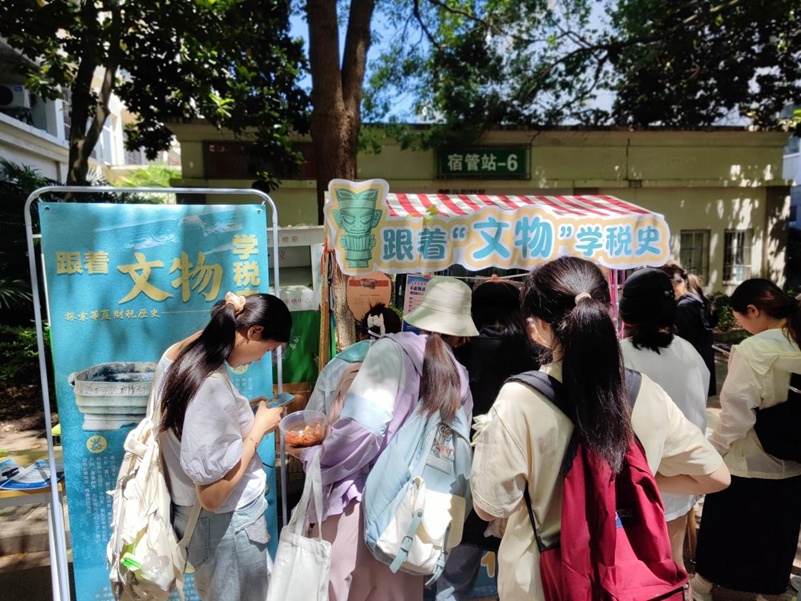 财政与税务学院财情税意工作室还搜集整理了南京税收博物馆珍藏品“遂公盨”“鄂君启金节”等珍贵文物设计成文创产品,把融入税史文物元素的题扇、书签、笔记本、水杯等,通过现场互动答题的方式赠送给社区同学,让大家在学习财政税史知识的同时还能收获文创奖品,实现了以物证史,以史育人。