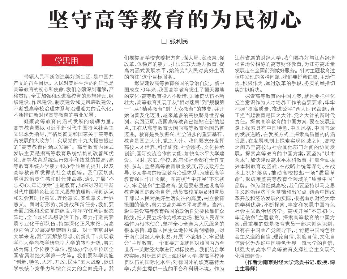 彰显建设高等教育强国的政治自觉。新中国成立70年来,我国高等教育发生了翻天覆地的变化:高等教育投入不断增加,师资队伍不断壮大,高等教育实现了从“相对落后”到“规模第一”,从“精英教育”到“大众教育”的转变,并开始向普及化迈进,越来越多的高校跻身世界前列。实践证明,我国高等教育已经站在新的起点,正在从高等教育大国向高等教育强国昂首迈进。教育是民族振兴、社会进步的重要基石,教育是国之大计、党之大计。我们要充分发挥高校人才培养、科学研究、社会服务、文化传承创新、国际交流合作的功能,加快高水平大学建设。同时,家庭、学校、政府和社会都有责任支持、参与、监督高等教育事业发展,形成政府主导、多元参与的新型教育治理体系,为建设高等教育强国作出贡献。在高校当中开展“不忘初心、牢记使命”主题教育,就是要彰显建设高等教育强国的政治自觉,动员高校党组织和党员干部以人民对美好生活向往的高度,树立教育报国的信念,努力提高办学水平与质量。当然,彰显建设高等教育强国的政治自觉要依靠群众路线,把人民立场作为根本立场,把为人民谋幸福作为根本使命,坚持全心全意为人民服务的根本宗旨,尊重人民主体地位和首创精神。对于南京财经大学来说,开展“不忘初心、牢记使命”主题教育,一个重要方面就是对照国内乃至世界一流财经大学进行对标找差。我们结合学校实际,对标国内的上海财经大学,提高学校师资队伍的国际化水平;对标国外的埃克塞特大学,为师生提供一流的平台和科研环境。作为江苏省属的财经大学,我们要办好与江苏经济强省地位相称的高等财经教育,为江苏高质量发展走在全国前列做好服务。针对主题教育过程中发现的各种问题,我们要锐意进取,主动作为,积极作为,通过改革的手段、务实的举措切实加以解决。