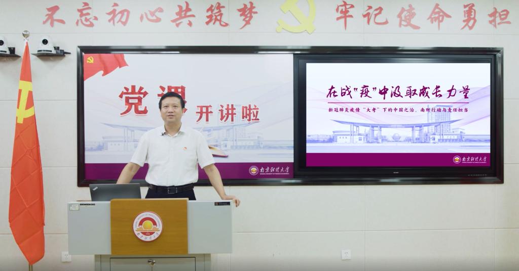 内容简介:为庆祝建党99周年,巩固拓展“不忘初心、牢记使命”主题教育成果,贯彻落实“不忘初心共筑梦·牢记使命勇担当——党课开讲啦”活动方案,2020年7月1日,南京财经大学党委书记张利民以在线视频方式,向全校党员、发展对象和入党积极分子讲授了题为“在战‘疫’中汲取成长力量——新冠肺炎疫情‘大考’下的中国之治、南财行动与责任担当”的专题党课。课程回顾了此次中国抗击新冠肺炎疫情的艰辛历程,通过一个个鲜活事迹和生动案例,讲述了战“疫”中的南财力量和南财精神,以此激励学校广大青年学子传承“自谦、自信、务实、超越”的校训精神,不惧风雨、勇挑重担,在磨难中历练和成长、反思和奋起。