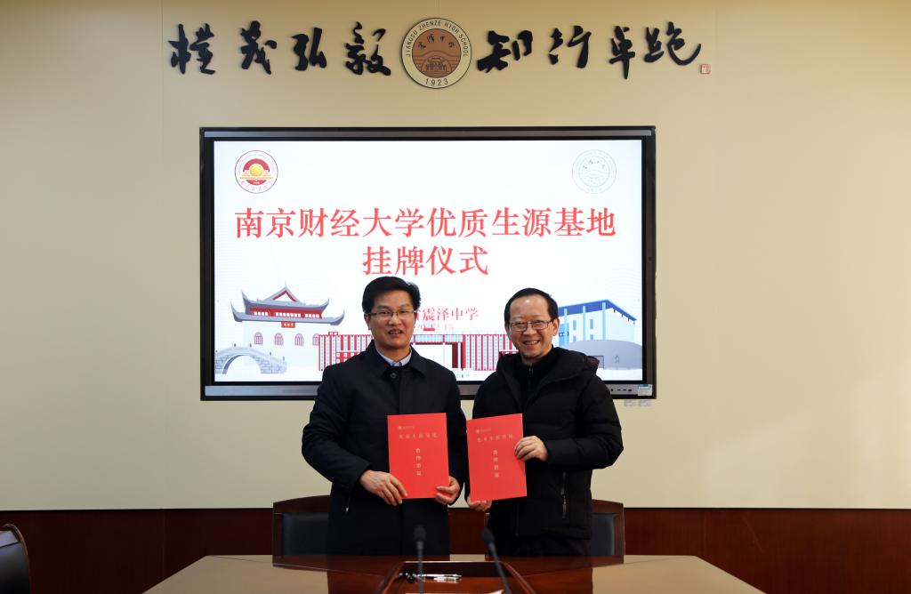 张阳军书记、孙菲副处长代表学校与两所中学签订了优质生源基地合作协议书,并授予“南京财经大学优质生源基地”铜牌。仪式后,双方围绕新高考背景下的招生动向进行了座谈。