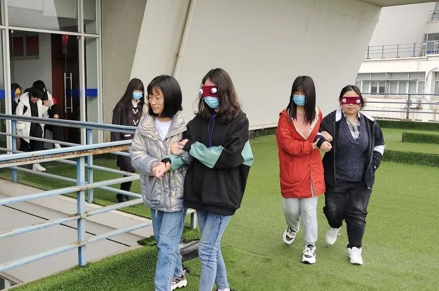第二项游戏是心情天气预报。同学们组成六到八人小组,完成纸条中相关活动要求,同学们认真回忆最近发生的事情,并在小组交流阶段与各位组员分享自己的心情,交流收获与感受。第三个活动在“信任盲行”,同学们被分为“哑巴”与“盲人”两个小组,“哑巴”同学要作为拐杖带领戴上眼罩的“盲人”同学从三楼下至二楼后回到原来的教室,在整个过程中不允许进行语言交流。虽然游戏过程坎坷,但同学们都配合默契,相互信任,彼此关心,相互扶持。游戏过程紧张刺激也充满着乐趣,大家也更深刻地体会到沟通与信任在人际交往中的重要性。本次团辅内容丰富,现场交流氛围积极良好,同学们在老师的引导下倾听内心的声音,体验到了幸福的真谛。