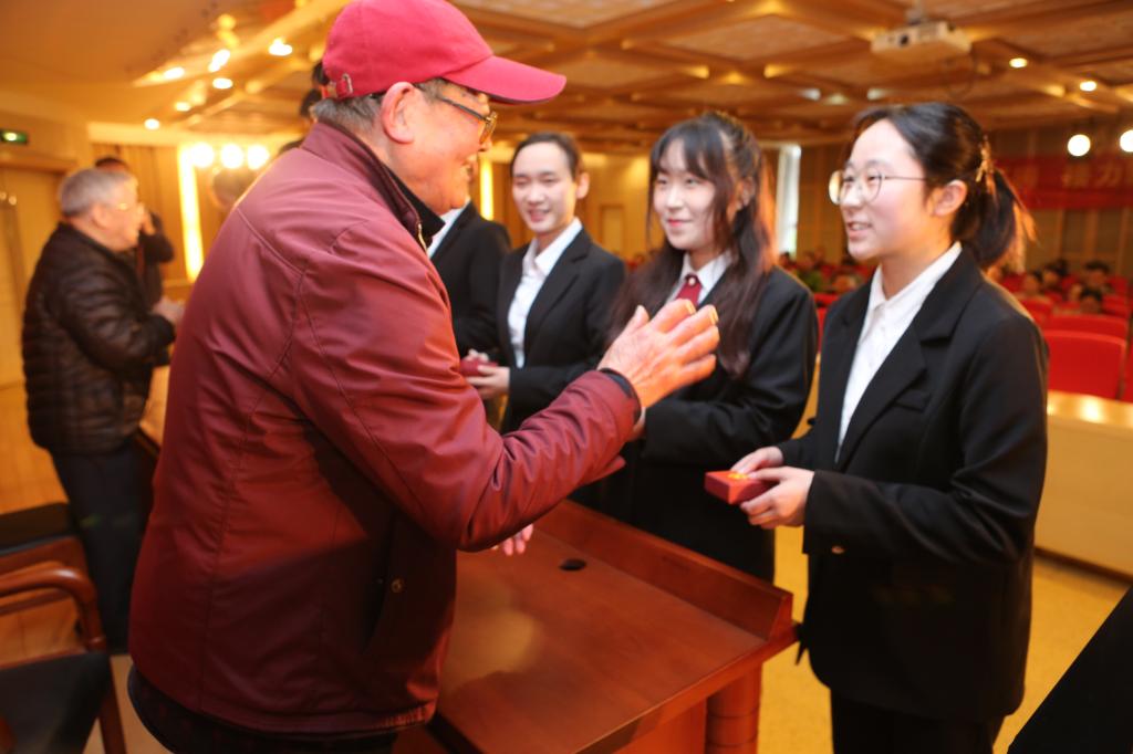 活动结束后,两位抗战老兵为工商管理学院的大学生党员授党徽,将信仰的接力棒交到青年学子的手中,同学们以青春的名义,朗诵《青春中国》,作出表态与宣言。