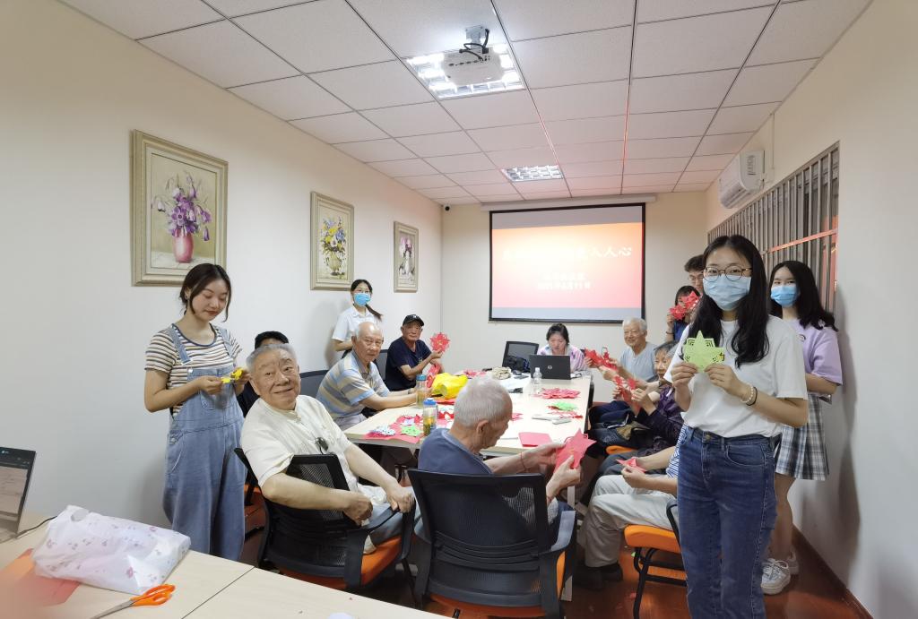 接着,志愿者们拿出红色刻纸,手把手教爷爷奶奶们制作一些简单的图案。爷爷奶奶们一边剪纸一边回忆以往的生活,一位奶奶介绍道:“在我们那个年代,结婚时候的喜字,还不是随便买的,而是请婚姻幸福的老一辈人亲手剪下喜字,寓意着幸福美满,也是长辈对晚辈的美好祝愿。”在志愿者的帮助下,爷爷奶奶们剪出了精致的红色五角星和双喜,表达自己对中国共产党成立100周年的祝福,老党员还回顾起了自己跟随党奋斗的光荣历程。志愿活动结束后,志愿者们和爷爷奶奶们互相交换了剪纸。志愿者沈郑娱感叹:“保护文化遗产,就是守护我们共有的精神家园。保护文化遗产,我们义不容辞!”