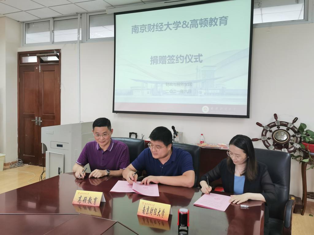 6月18日下午,我校与高顿教育在仙林校区德经楼408会议室举办捐赠签约仪式。校对外联络处副处长裴银伟,高顿教育南京分公司总经理、高顿合伙人谢斌,财政与税务学院党委书记陈苏,高顿教育南京仙林校区负责人何伟,高顿教育高校事业部华东区高级经理张美娟参加仪式。仪式由财政与税务学院党委副书记李慕原主持。