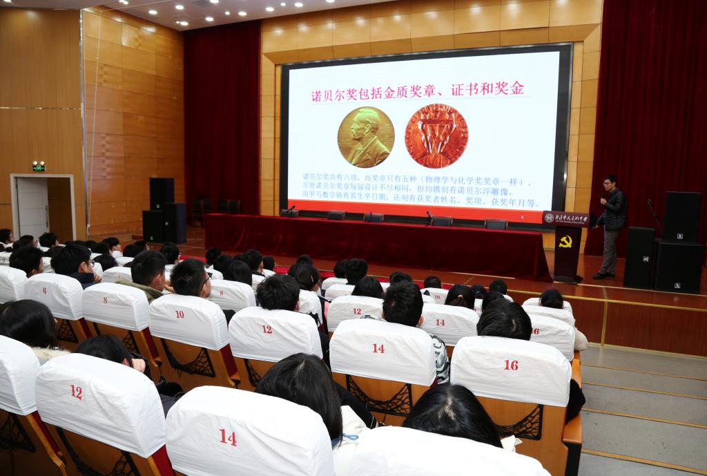 仪式结束后,黄顺林主任为高三学子作了题为“数学与诺贝尔奖的不解之缘”的讲座,讲座从诺贝尔奖的历史、诺贝尔奖为什么没有数学奖、数学对诺贝尔经济学奖的重要贡献、诺贝尔经济学奖获得者与数学的渊源等方面展开,强调数学等基础学科的重要性,鼓励学生在中学阶段学好数学,为以后的专业学习打下坚实的基础。