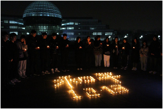 纸鹤烛光寄哀思。营销与物流管理学院学子点燃了一束束烛光,手折千纸鹤,寄托哀思,一次次的对折、翻折包含着的是同学们对泱泱中华的无尽情思。会计学院在德济楼平台将蜡烛摆成“12·13”字样,静默哀悼,并在“勿忘国耻、警钟长鸣、以史为鉴、吾辈自强”签上自己的名字,缅怀遇难同胞,表达爱国热情。新闻学院学子在学校图书馆前摆下28支蜡烛呈现“12·13”,铭记沉重历史;113支蜡烛点亮“和平·勿忘”,照亮前行之路。师生手捧蜡烛,燃起一盏盏烛火,安静肃穆的烛光下,同学们献花于蜡烛下,全体成员默哀三分钟,缅怀逝者,祈愿和平。在博文楼103教室,应用数学学院的同学们神情肃穆,认真地翻折着手中的白纸,瞬间,一只只洁白无瑕的“和平鸽”诞生。随后,大家将“和平鸽”小心翼翼地放在地上,一只连着一只拼成“1213”,寄托哀思。