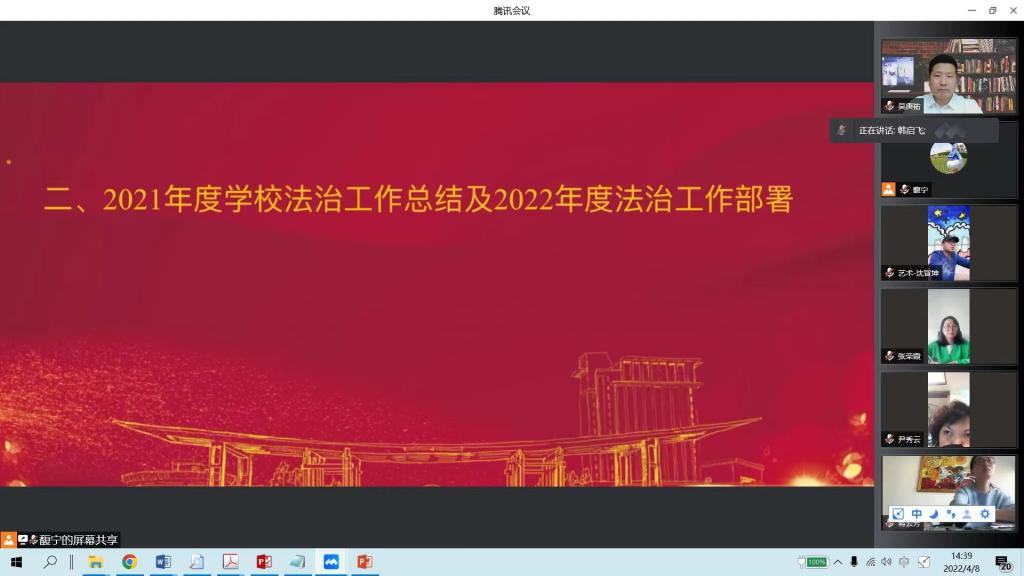 改革发展办公室副主任韩启飞汇报了2021年度学校法治工作情况及2022年度法治工作计划。2021年,学校坚持以习近平新时代中国特色社会主义思想为指导,坚持党对全民普法工作的领导,贯彻落实党中央决策部署,实现学校治理体系和治理能力现代化。各相关部门坚持围绕中心、服务大局,扎实开展基层依法治理工作,学校依法治理水平显著提升。2022年是深入实施“八五”普法规划的关键之年,学校将以习近平新时代中国特色社会主义思想为指导,结合学校工作实际,全面落实《南京财经大学2022年度推进依法治校实施方案》,进一步推进依法治校工作。