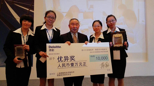 此次大中华地区“德勤税务精英挑战赛”全国共有64所高校参赛,在分组比赛中,我校代表队在64所参赛高校中脱颖而出,成为晋身全国决赛的13支队伍之一。通过个案分析、PPT展示、评委提问等环节,经德勤高级合伙人与外聘专家组成的评审团评审,北京大学、上海财经大学和中山大学的代表队分获冠、亚、季军。我校代表队获得“优异奖”。同时,我校代表队参赛简介作品在分组比赛中成为所属赛区最多人次点击浏览的作品,获2014年度德勤税务精英挑战赛(上海赛区)“最具人气奖”。