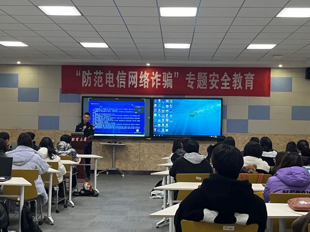 潘斗超警官向同学们介绍了常见的58种诈骗手法及9大诈骗类型,列举了电信诈骗的典型案例。他结合自身多年办案经验,生动讲解了当前电信诈骗分子的作案手段,并向同学传授甄别常见电信诈骗的方法及防范措施。他提醒同学们,疫情当下,要高度警惕犯罪分子通过时空轨迹交集等进行信息诈骗,避免陷入“网络刷单”骗局,防微杜渐,有效规避“网恋陷阱”“杀猪盘”等诈骗风险。