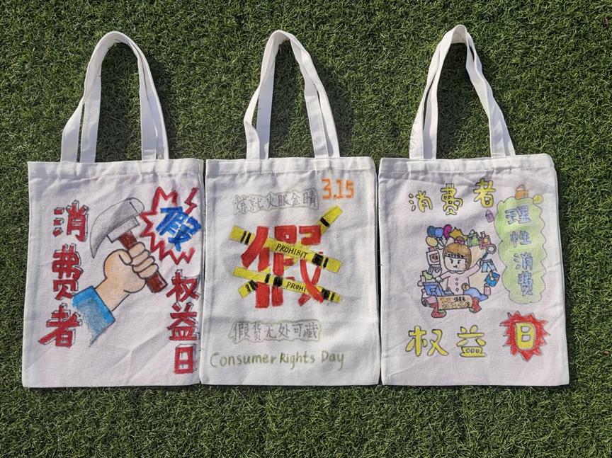 国际经贸学院开展了“美好消费,‘包’驾护航”主题活动。同学们以手绘帆布包的方式宣传消费维权知识,引导大家合理消费维权。“半开的礼物盒里藏着一颗心,一旁的小旗帜上印着‘315’,寓意着‘权’心‘权’意只为你,希望通过这幅画引起大家对消费者权益的重视。”贸经2201班的陈晨介绍了她的作品。同学们还自制了购物小包,一根根毛线紧密排列着、纵横交错,不露一丝空隙,小巧精致的蝴蝶结点缀在小包上,增添了些许灵动。