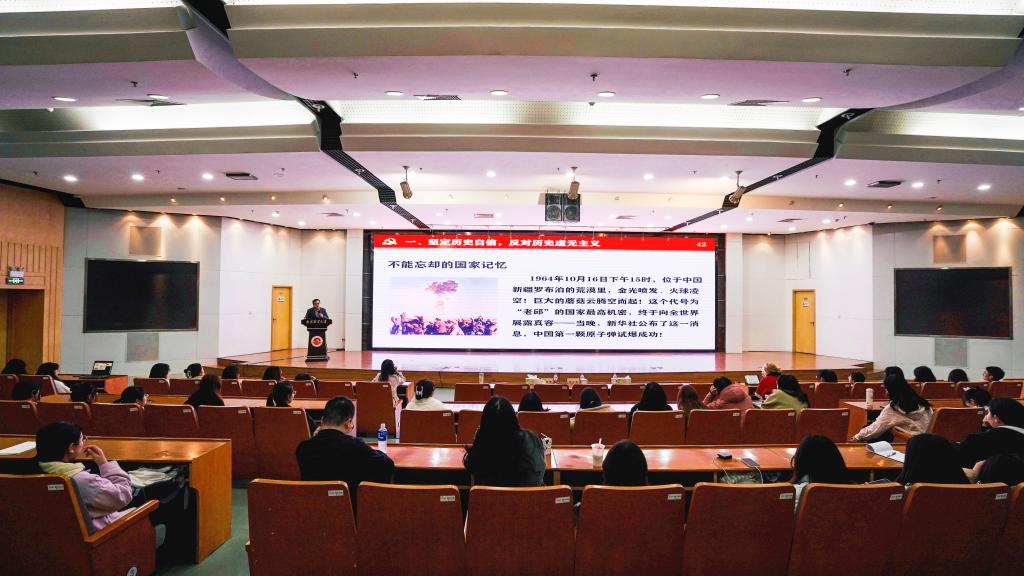 为带领我校学生深入学习贯彻党的二十大精神,凝聚我校广大青年听党话、跟党走的青春力量,3月24日晚上,由党委学生工作部主办、校学生会承办的第三十八期“南财公开课”在仙林校区图书馆一楼报告厅开讲。本次公开课以“时说新语:我们处在怎么样的新时代?——学习党的二十大精神” 为题,特邀江南大学马克思主义学院博士生导师、哲学博士唐忠宝教授主讲。党委学生工作部部长、学生处处长韩力争,学生处副处长袁怡琨及近300名学生参加公开课。