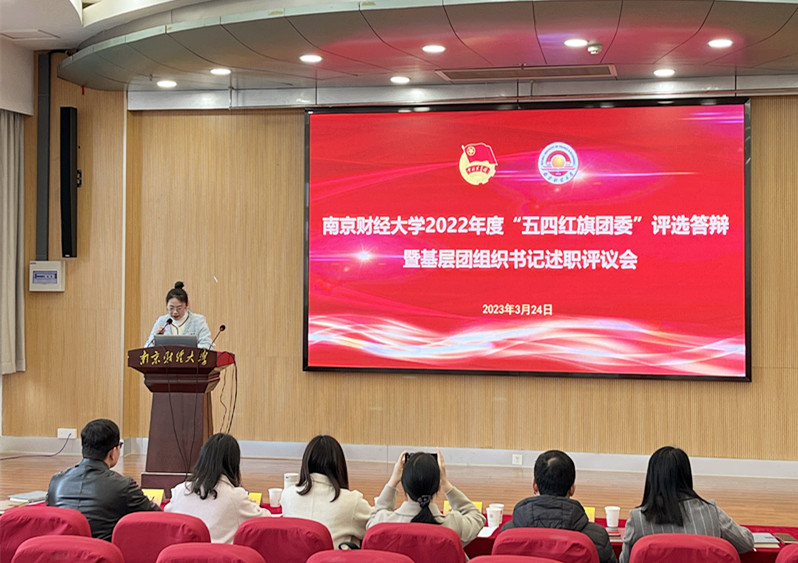 3月24日下午,我校2022年度“五四红旗团委”答辩暨基层团组织书记述职评议会在仙林校区大学生活动中心三楼报告厅举行。南京师范大学学生工作处副处长孙茂华,南京邮电大学团委副书记彭春雪,我校党委组织部副部长王鑫,党委学生工作部副部长、学生处副处长袁怡琨,校团委书记张蔚伟担任评委。校团委副书记陈涛及全体工作人员,各学院团委负责人参加会议。会议由校团委组织与社团管理科科长乔俊鸽主持。