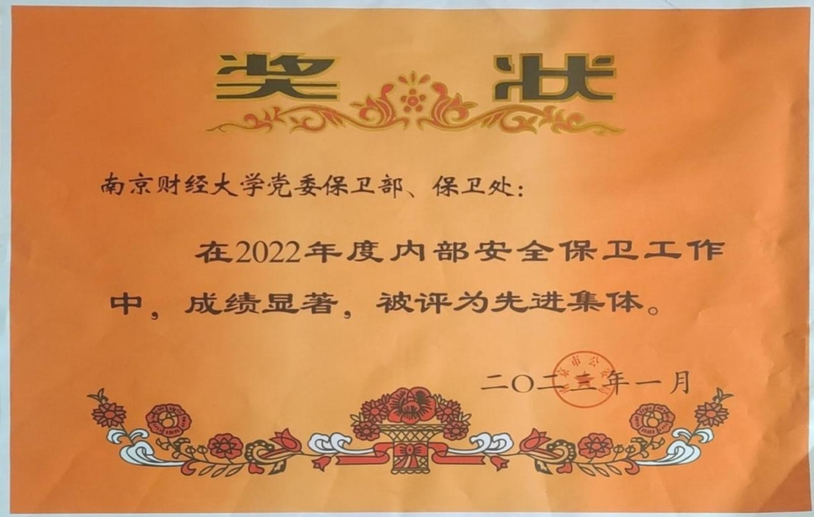 近日,保卫处被南京市公安局授予2022年度全市“内部安全保卫工作先进集体”荣誉称号。