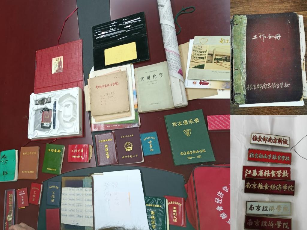 本次活动共收到粮食部南京干校、粮食部南京粮食学校、江苏省粮食学校、南京粮食经济学院、南京经济学院校徽、工作手册、工作证等实物档案40余件。
