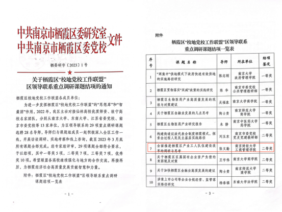 栖霞区“校地党校工作联盟”区领导联系重点调研课题经过专家组评审,于近期公布获奖结果。我校共有8项课题分获二、三等奖及优秀奖,其中二等奖2项、三等奖2项、优秀奖4项。