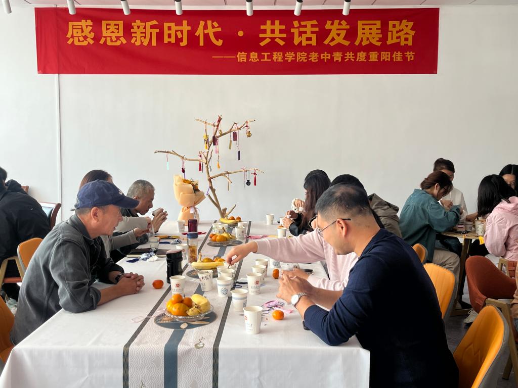 信息工程学院开展主题为“感恩新时代·共话发展路”的活动,邀请退休老教师与学院青年师生一起做香囊、话传承、谋发展。院领导班子成员,退休教师程国达、杨小宁,学院青年师生参加活动。活动伊始,学院青年学生代表为退休教师代表送上鲜花,随后,大家一起制作茱萸香囊。院党委书记孙菲向全院退休老同志、老教师送上诚挚的祝福。程国达、杨小宁代表全院退休教师感谢学院的关心,表示会一如既往关心支持学院事业发展,并希望青年教师以鸿鹄之志展鲲鹏之翅,孜孜不倦、敢于创新,不断为学院高质量发展作出贡献。