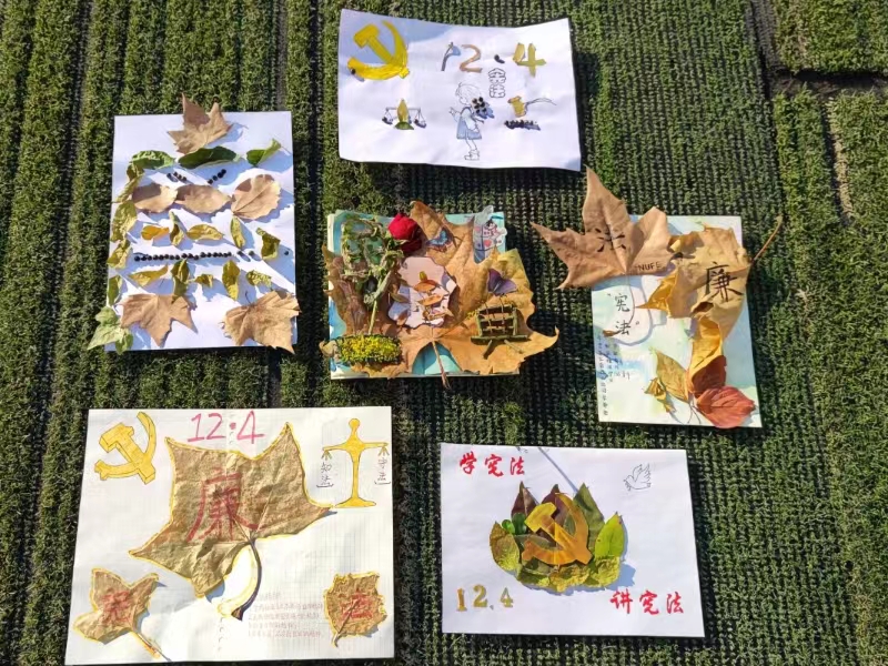 工商管理学院开展以“宪法入画,片片廉心”为主题的自然物拼贴画大赛,鼓励同学们观察校园,走进自然,拣拾落叶、树枝、花朵等,拼贴出心目中的宪法,在劳动过程中体会与宣扬宪法精神。落叶无痕而创意无限,同学们用心创作,发挥奇思妙想,利用缤纷的落叶,融入宪法元素,拼凑出党徽、“廉”“法”等模样,展现出当代青年对宪法精神的尊崇与蓬勃的正能量。