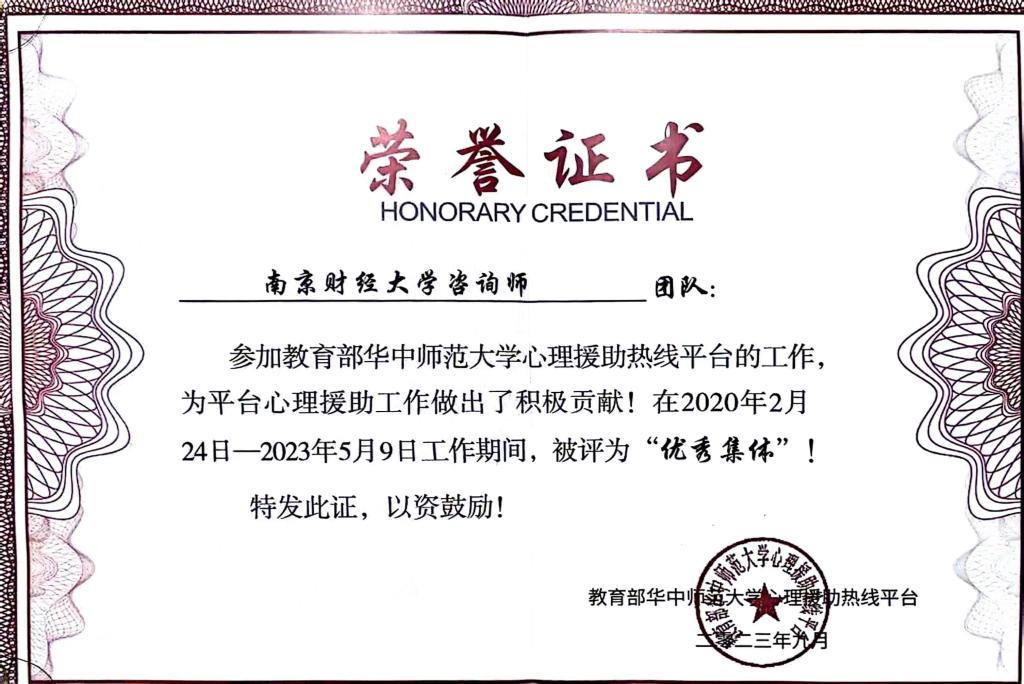 近日,教育部华中师范大学心理援助热线进行2020-2023年平台心理援助工作表彰,我校获评“优秀集体”。