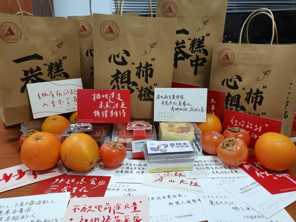 会计学院开展考研送温暖活动,学院领导和辅导员共同为考研学子加油。学院领导关切询问考研学子的身体健康和心理状况,并结合相关数据分析了今年考研形势,鼓励同学们坚定信心、全力以赴、奋力拼搏,为考研学子们注入强心剂。学院领导、老师们为考研学子送上精美的定制福袋,其中不仅有寓意着“心想事成”的福柿与橙子、“一举高中”的小蛋糕、文具套装,还有承载着学院老师们、学弟学妹们真切祝福的小卡片。