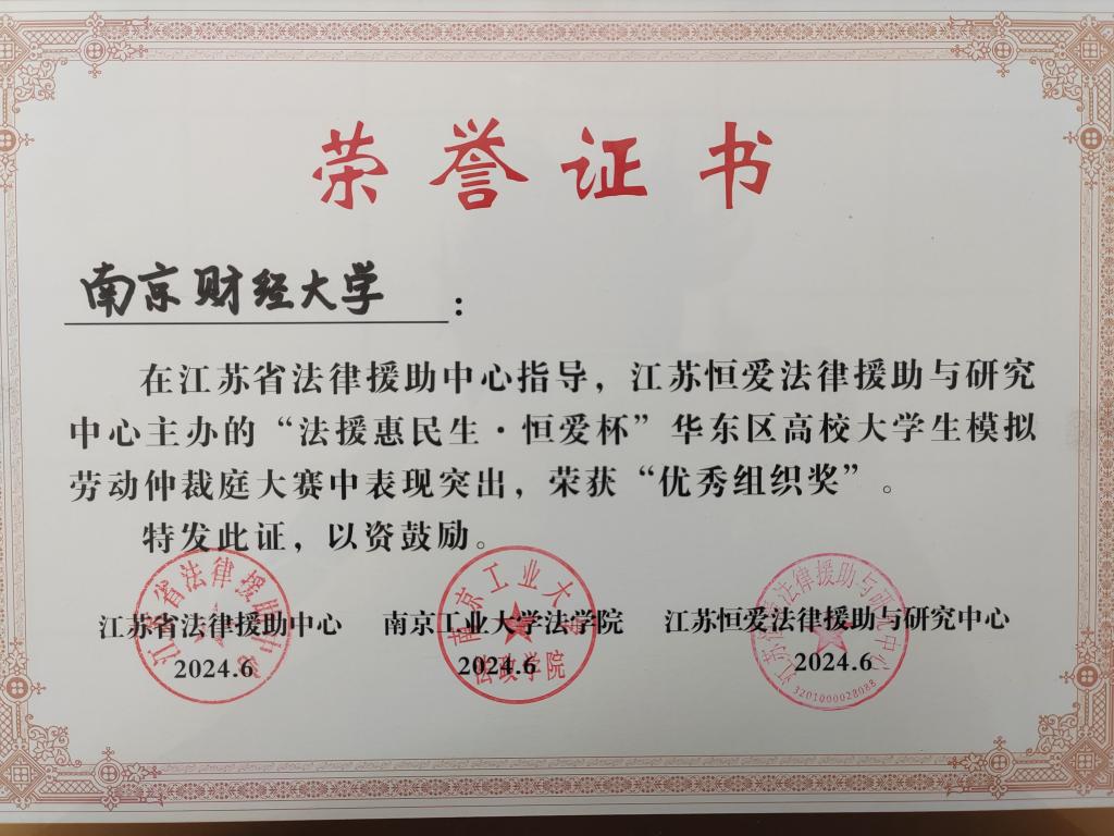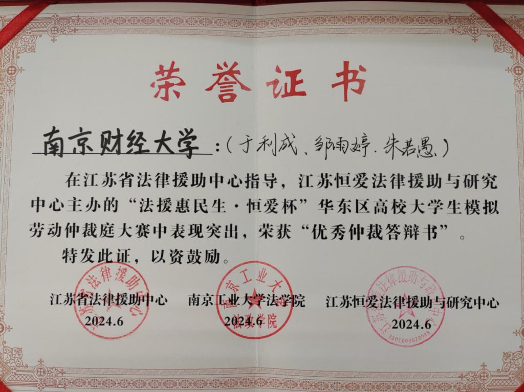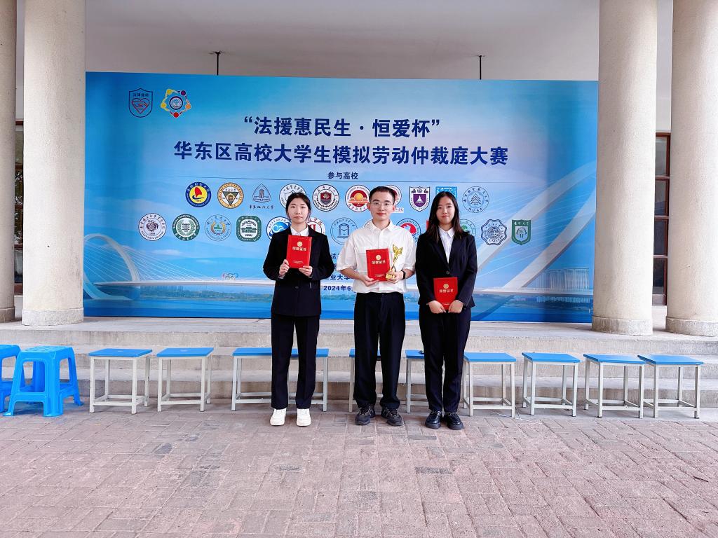 近日,第二届“法援惠民生·恒爱杯”华东区高校大学生模拟劳动仲裁庭大赛决赛在南京工业大学举办。我校由汪华亮老师指导,邹雨婷、于利成、朱若愚组成的被申请人代表队经过激烈角逐,获“被申请人队”季军,提交的仲裁答辩书获评“优秀仲裁答辩书”,我校荣获“优秀组织奖”。