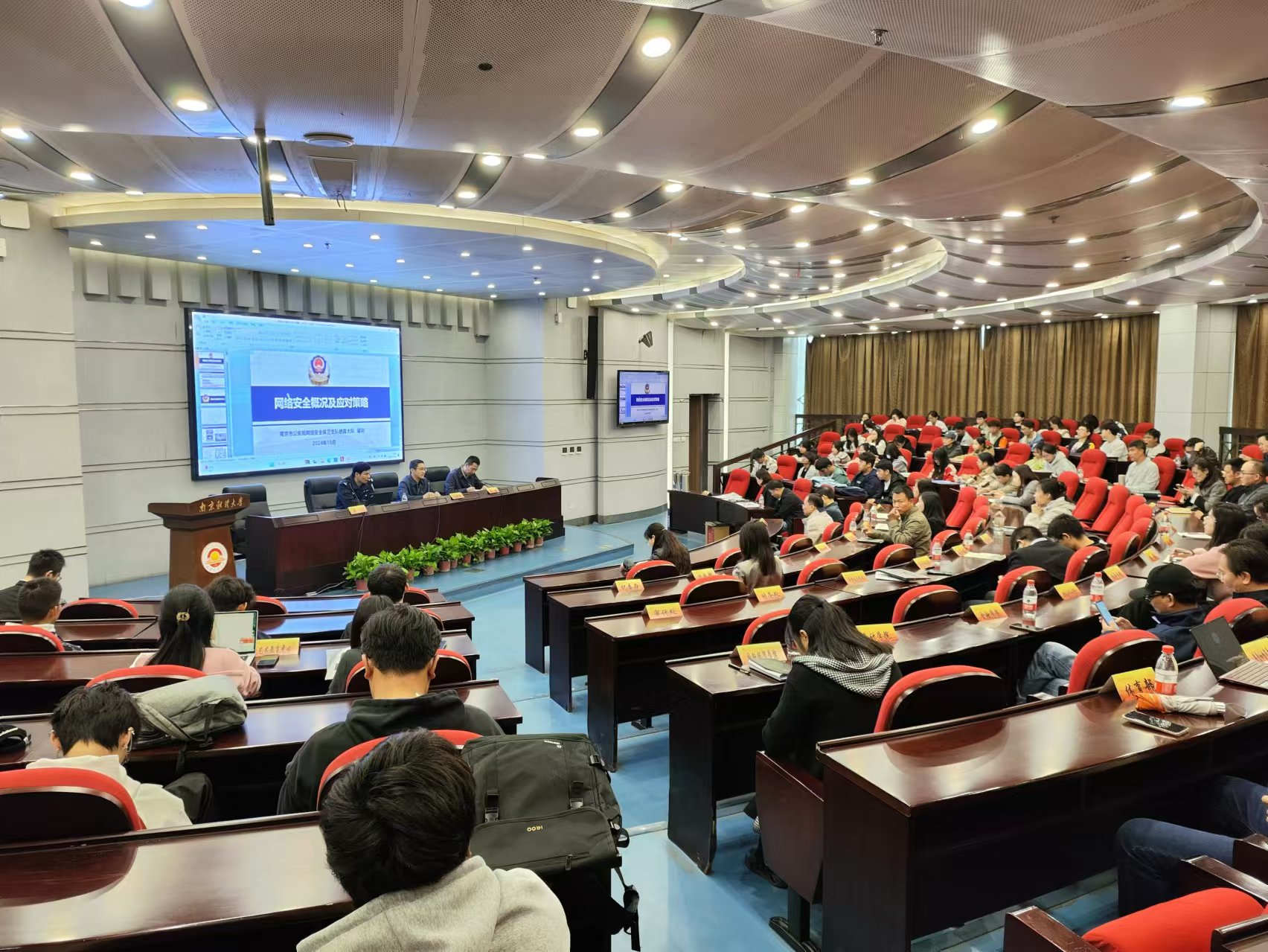 南京市公安局网安十三大队一级技术主管梁羽作“网络安全概况及对策”专题辅导。梁羽警官结合日常参与处置的网络安全事件,介绍了当前国际、国内网络空间面临的日益严峻的安全问题,围绕个人信息安全、网络电信诈骗、网络非法活动等,以案说法,倡议大家自觉抵制网上不良信息,不参与违法活动,提高信息安全意识,防范个人信息泄露,为师生正确使用网络终端和社交软件等给出指导性建议。