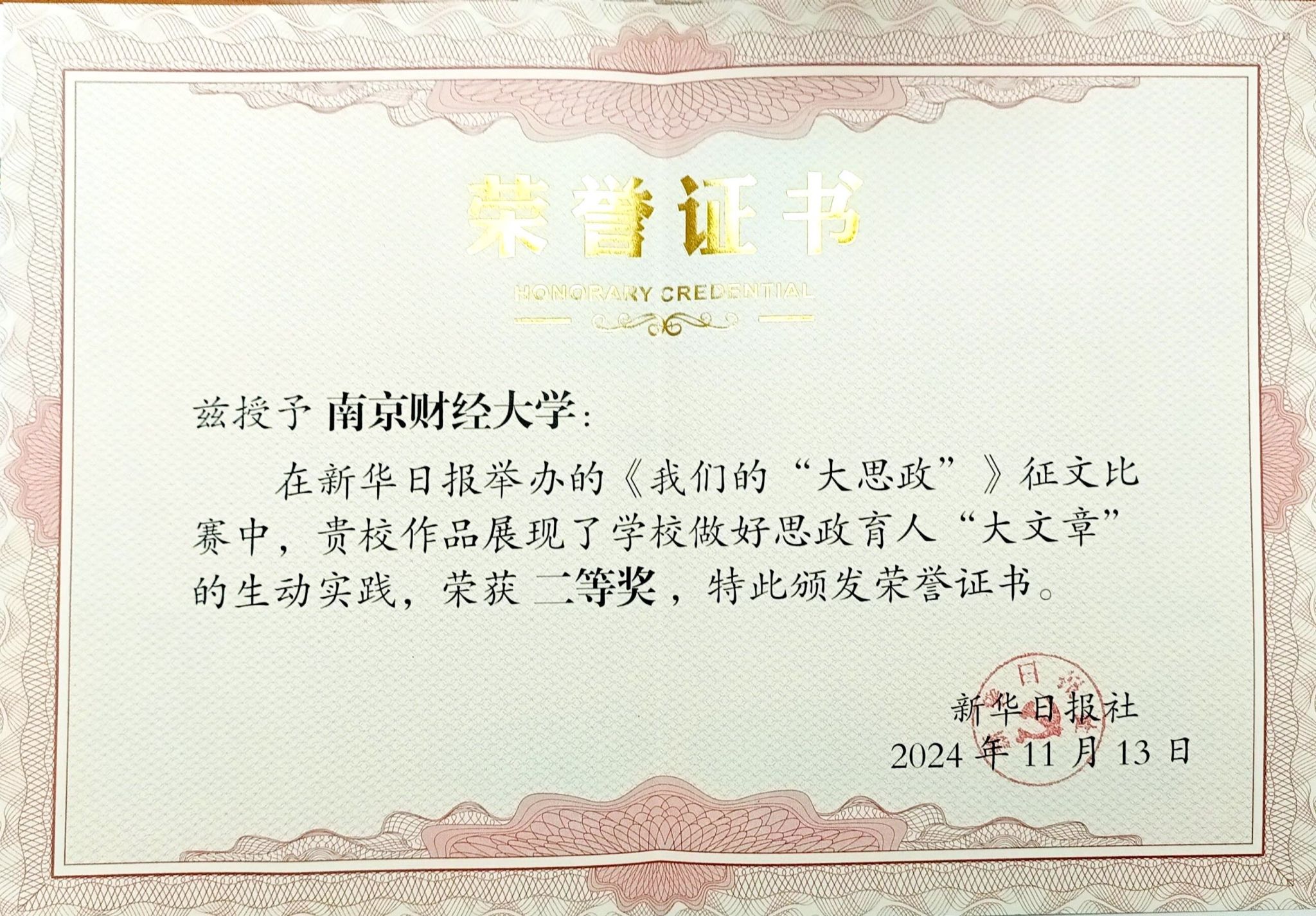 11月13日,省教育厅、省委教育工委联合新华日报社共同举办“用好党报党媒、助力学校发展”座谈会。会上举行了新华日报社《我们的“大思政”》征文比赛获奖作品和高校党报发行先进单位颁奖仪式。我校作品《南京财经大学:让爱国情怀融入青春血脉》(作者:施卫娟)在《我们的“大思政”》征文比赛中获二等奖。同时,我校获评新华日报社高校党报发行先进单位。
