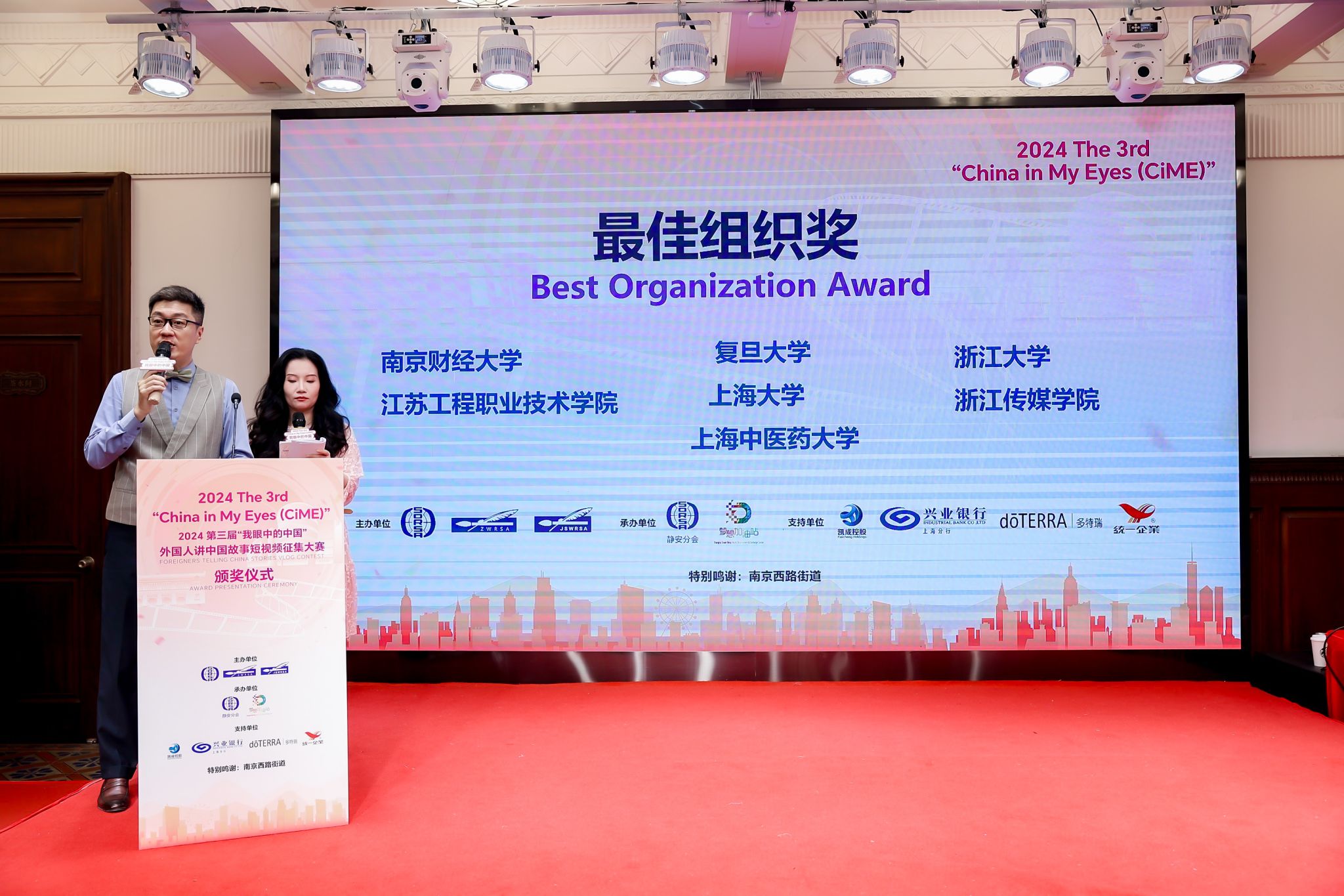 近日,2024第三届“我眼中的中国China in My Eyes(CiME)”外国人讲中国故事短视频大赛颁奖仪式在上海福民会馆举行。我校在此次大赛中表现优异,荣获“最佳组织奖”,3件外国留学生作品获“入围奖”,展现了我校外国留学生的风采。