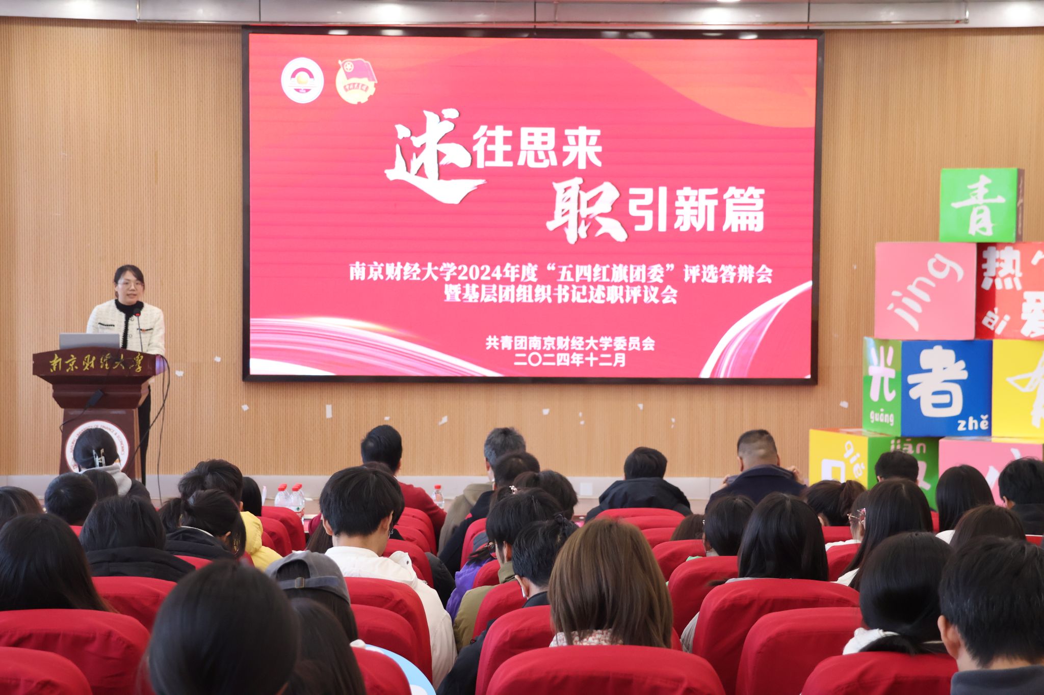 12月27日下午,2024年度“五四红旗团委”答辩暨基层团组织书记述职评议会在仙林校区大学生活动中心三楼报告厅举行。团省委委员、南京工业大学团委书记王郁超,南京邮电大学团委书记秦昌建,南京师范大学团委副书记徐逸霏,我校团委副书记胡新蕲、陈涛担任评委。各学院团委书记、学生副书记,校五星级团支部书记、五四红旗团支部书记代表到场观摩。会议由校团委组织与社团管理科科长乔俊鸽主持。