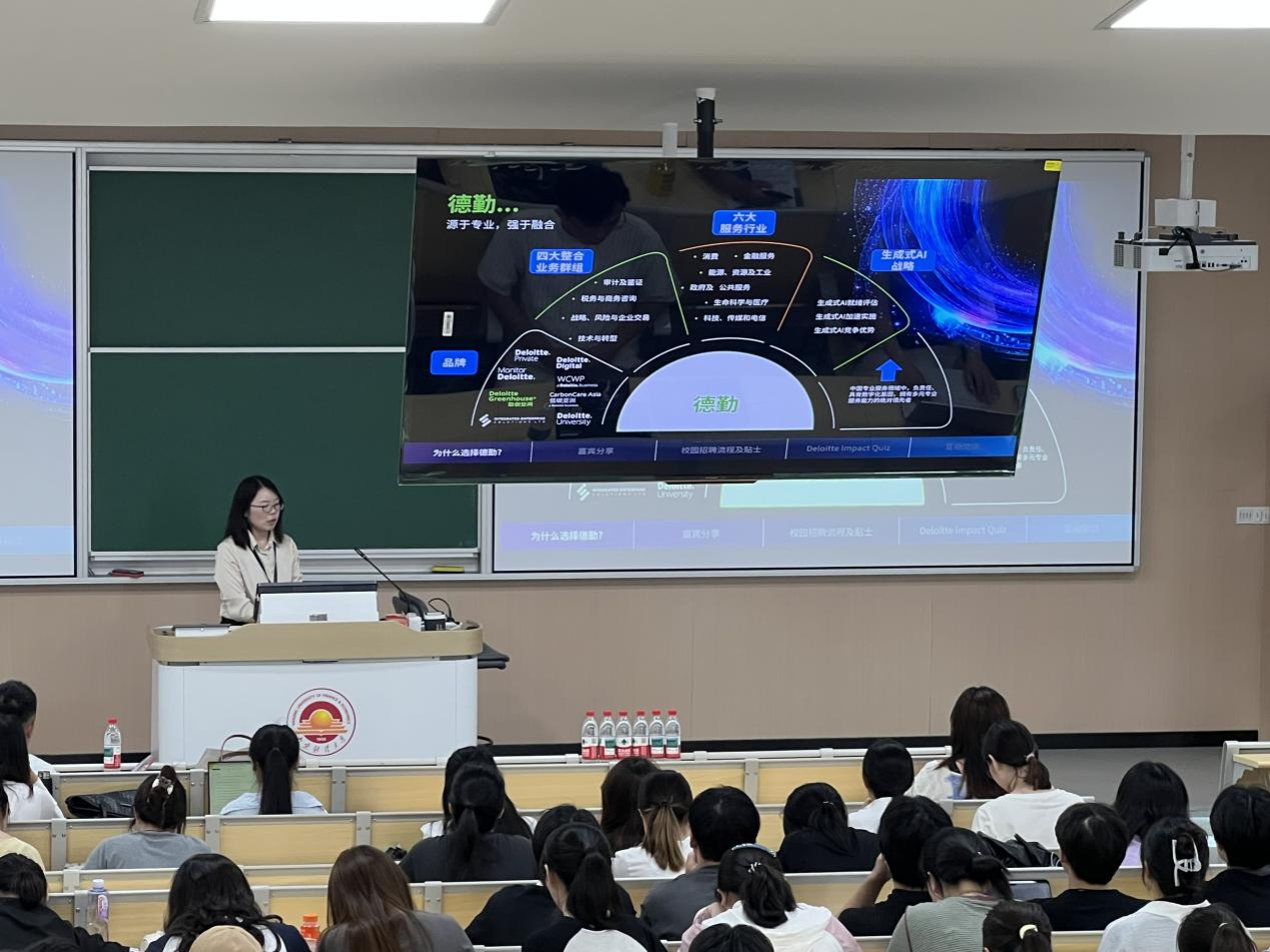 在德勤会计师事务所宣讲会现场,德勤税务与咨询部高级经理陈春兰详细介绍了企业发展战略及核心业务板块;高级审计员与我校校友、审计部助理经理,结合自身经历分享了职业成长路径;人力资源部代表对2026届校园招聘流程进行全面解读,并针对毕业生提出的疑问逐一解答。互动环节,毕业生围绕简历修改、职业规划等关键问题与企业代表深入交流。