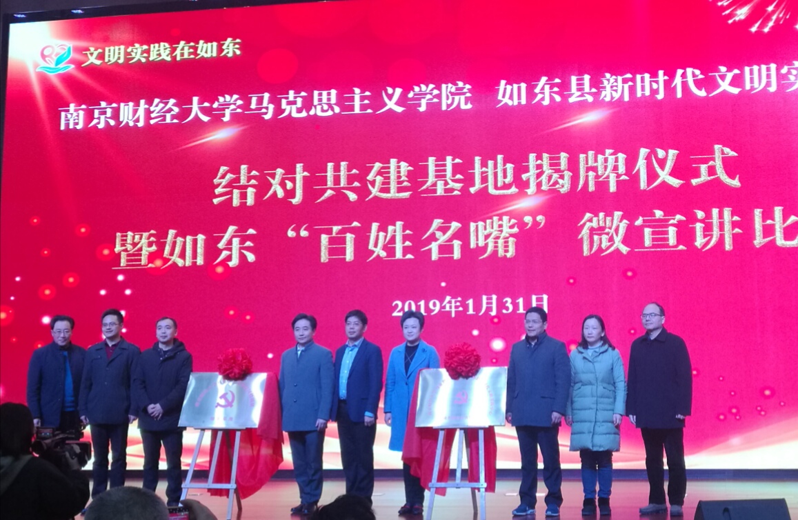南京财经大学马克思主义学院院长梅景辉教授和县委副书记陈雷共同为南京财经大学马克思主义学院国情调研如东基地、南京财经大学马克思主义学院如东县新时代文明实践中心理论传播结对共建基地揭牌。