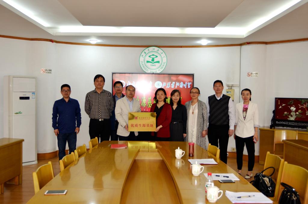 5月10日上午,我校在江苏省江都中学建立优质生源基地,并举行签约授牌仪式。江都中学党委书记李维奇、校长周明龙、副校长季娴,我校金融学院党委书记李玉琴、学生处副处长孙菲等参加仪式。