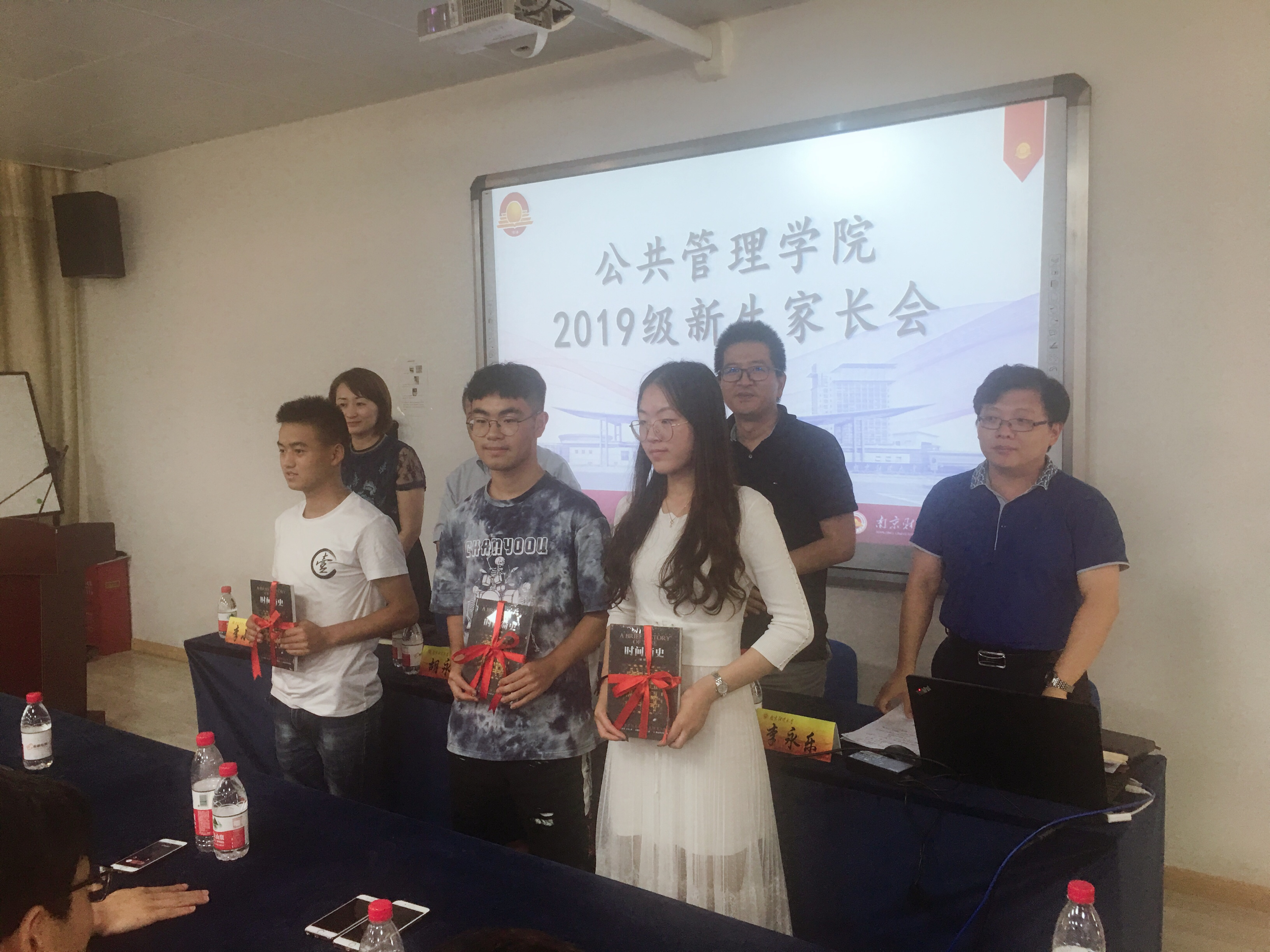 在2019级新生家长会上,公共管理学院启动2019年读书节。活动现场,学院领导向同学们赠送了《时间简史》等经典书目,希望新生们亲近经典、走近大师,自觉拓展知识视野。