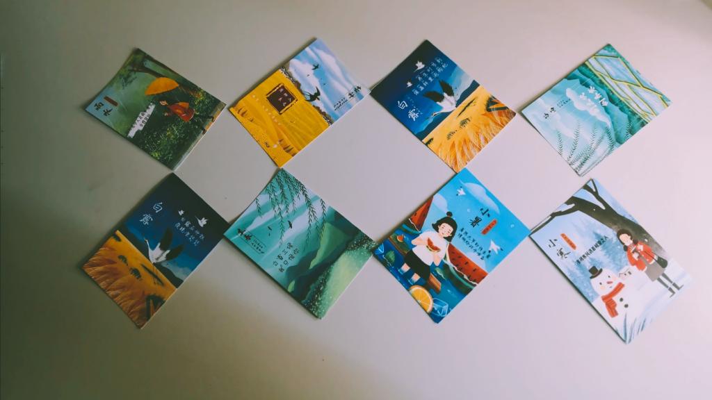 暖心卡包括软萌可爱和文艺清新两个系列,每个系列卡片上都有一个暖心提示,采用时下流行的网络语言,或俏皮活泼,或文艺清新,很接地气。比如“记得告诉喜欢的人要降温啦,我已经告诉你了哦”“小雪了,面对这冷天,想要免起床金牌嘛,还是送你早起上课驱动牌吧”“想吃糖炒栗子,也想借你的口袋揣一揣”“种瓜得瓜,种豆得豆”“养生时节到,保温杯里泡枸杞”“冬至的第一个烤红薯,要和你喜欢的人一人一半哦”等。二十四节气暖心提示简明扼要,朗朗上口。比如“立春三候,我只候你”“春风十里,不如想你”“春雷惊不走的是我对你的思念”“蒹葭苍苍白露霜,晨曦清露滴衣裳”“寒霜降,天气凉,大雁向南方。红叶舞,染青霜,莫忘添衣裳”“凌冽寒风遇着相爱之人”等。卡片正面是精致的节气介绍,包括物候、农耕、饮食、衣着等方面的暖心提醒,背面写着同学们的祝福与叮嘱,一字一句,都浸透着同学们对身边人满满的关爱和深情。同学们还在仙林校区德济楼五楼草坪围坐吟诵有关“二十四节气”的诗歌,体味“二十四节气”的魅力,学习有关“二十四节气”的习俗和小知识。最后,同学们一起把制作好的“二十四节气券”送给老师和同学。